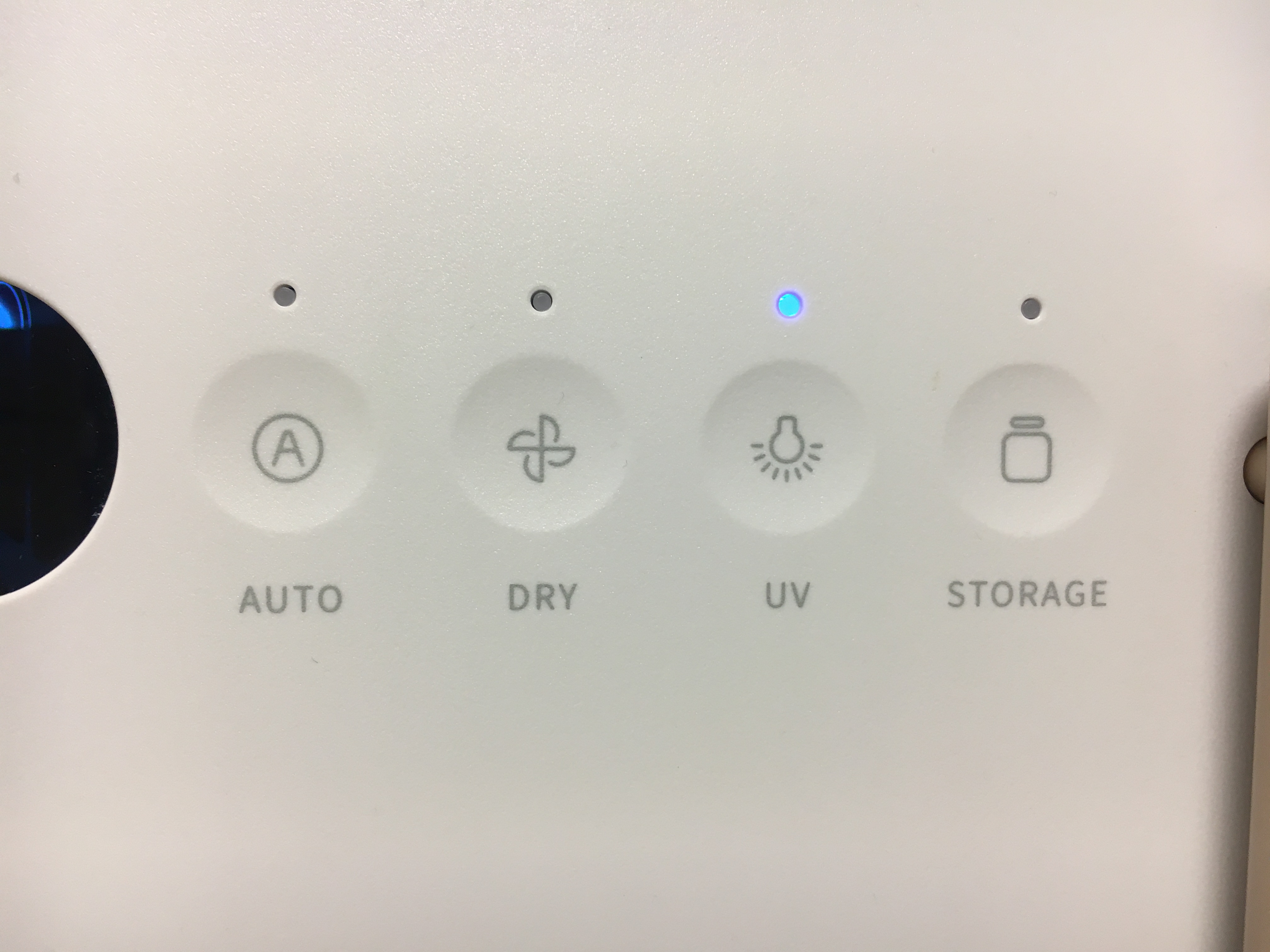 별거 없습니다. 드라이는 열풍인데, 마스크에 습기가 있을 때 말려주는 역할로 쓰면 됩니다. 온도가 대략 50도는 되는 것 같은데, 이정도 온도에 마스크의 정전기필더가 열을 받으면 유해물질이 나오는지는 모르겠습니다. 그래서 가급적 자외선만 쓰려고 하고 있습니다. UV로 되어있는 부분은 울트라바이올렛 즉 자외선을 의미합니다. 켜면 10분 또는 15분 돌아가는데 이때 수은등이 나오고 자외선이 조사됩니다. 이때 펜도 돌기 때문에 마스크를 건조하는데 무리가 없어보입니다.