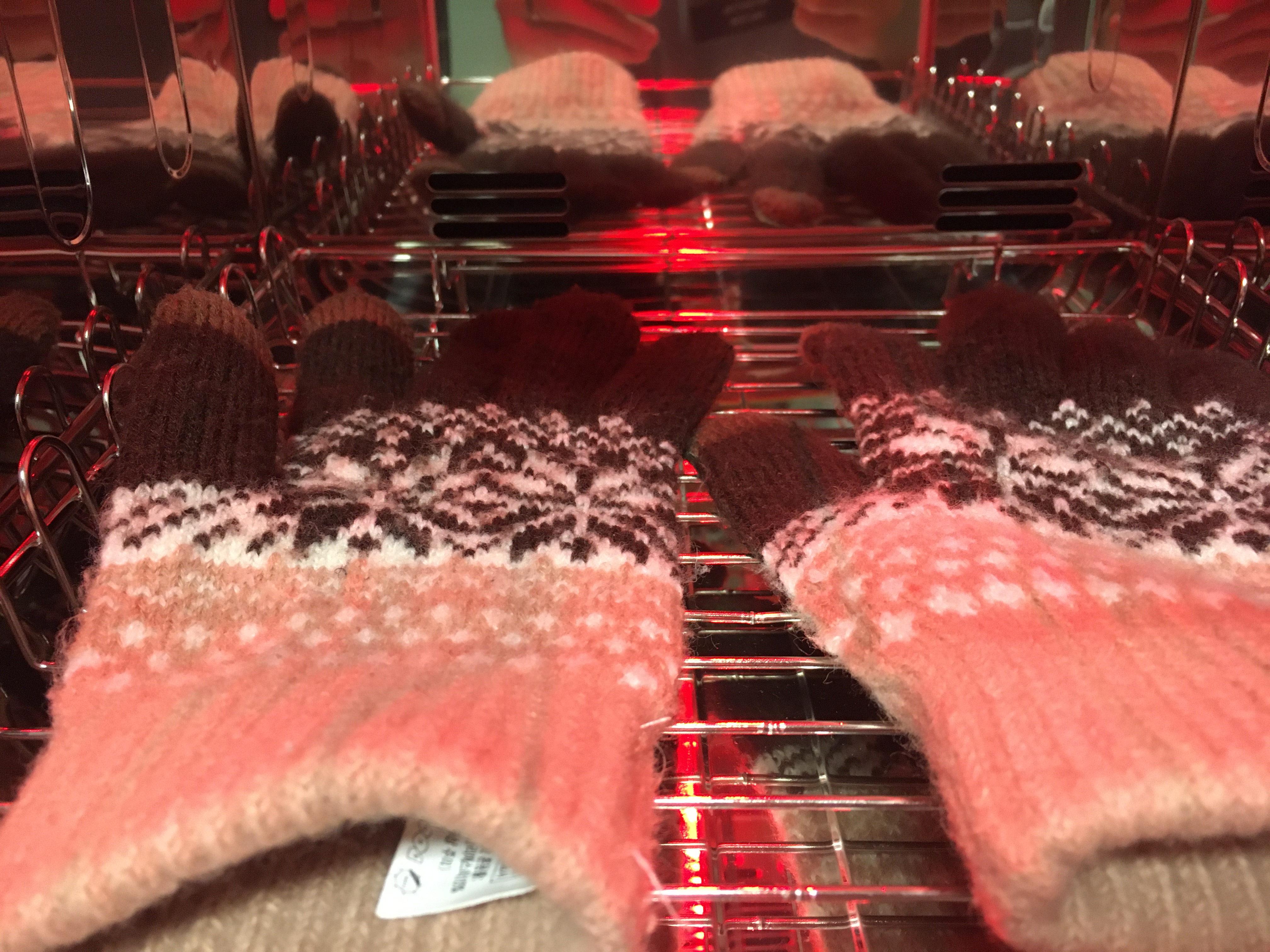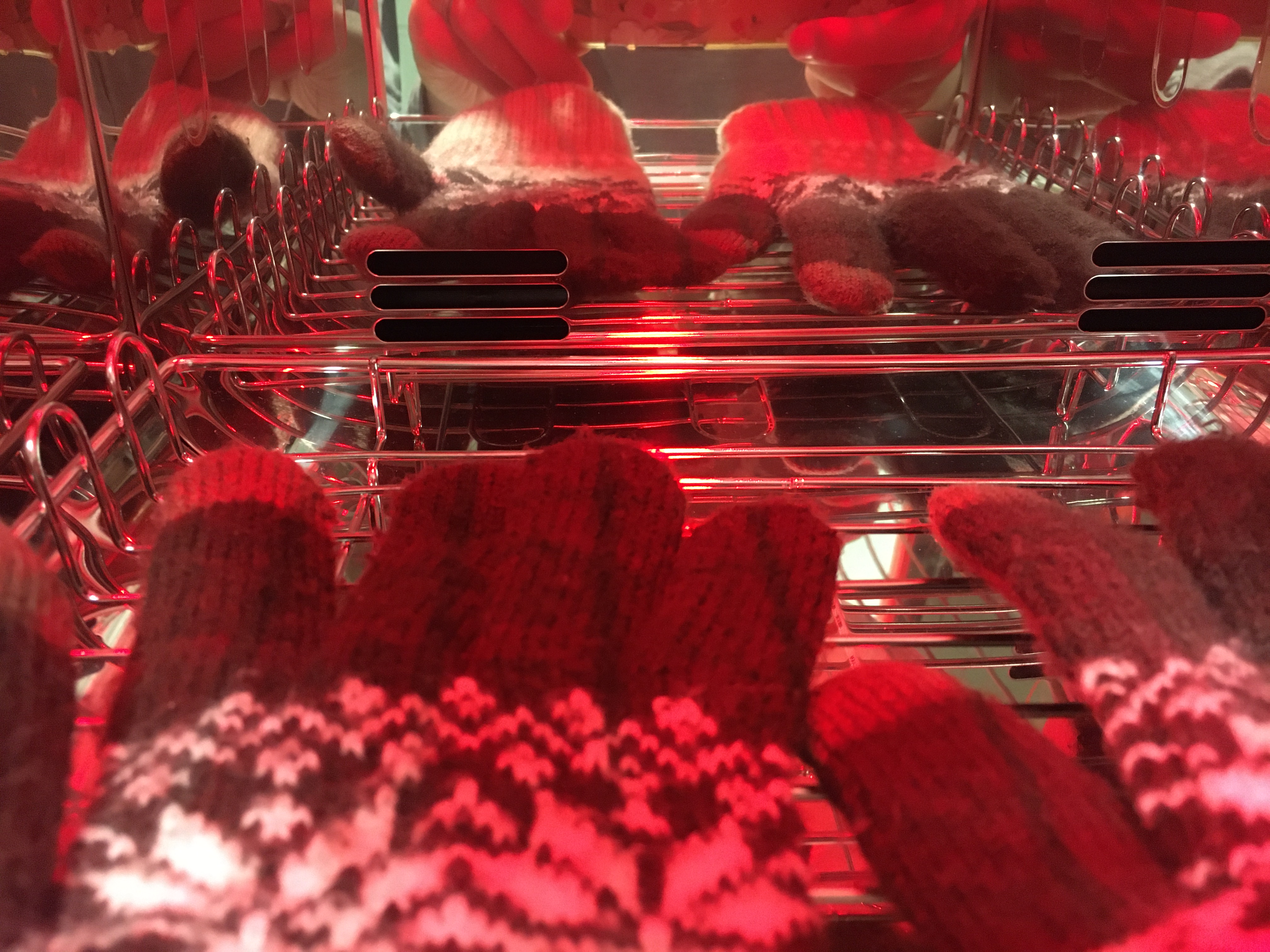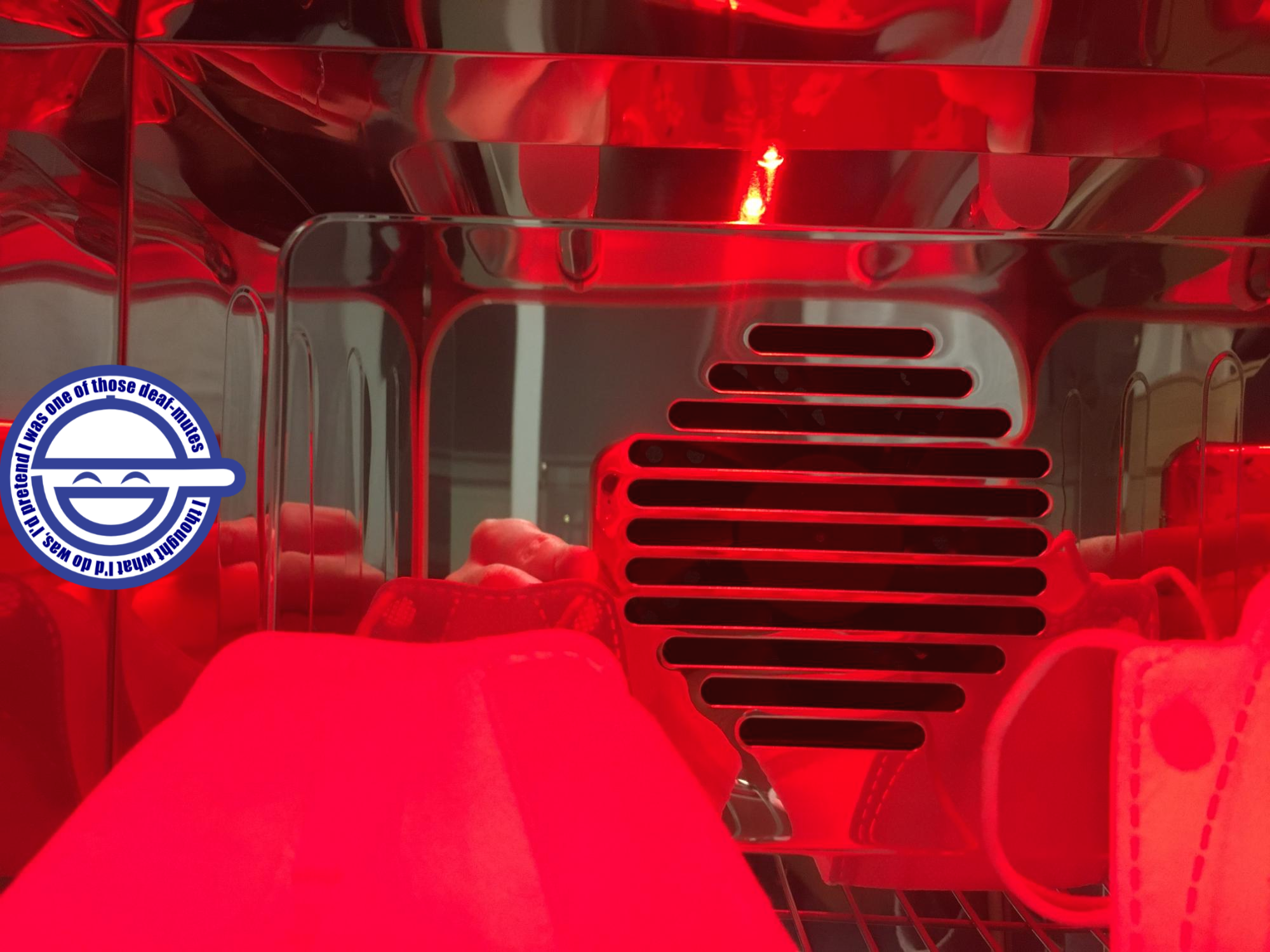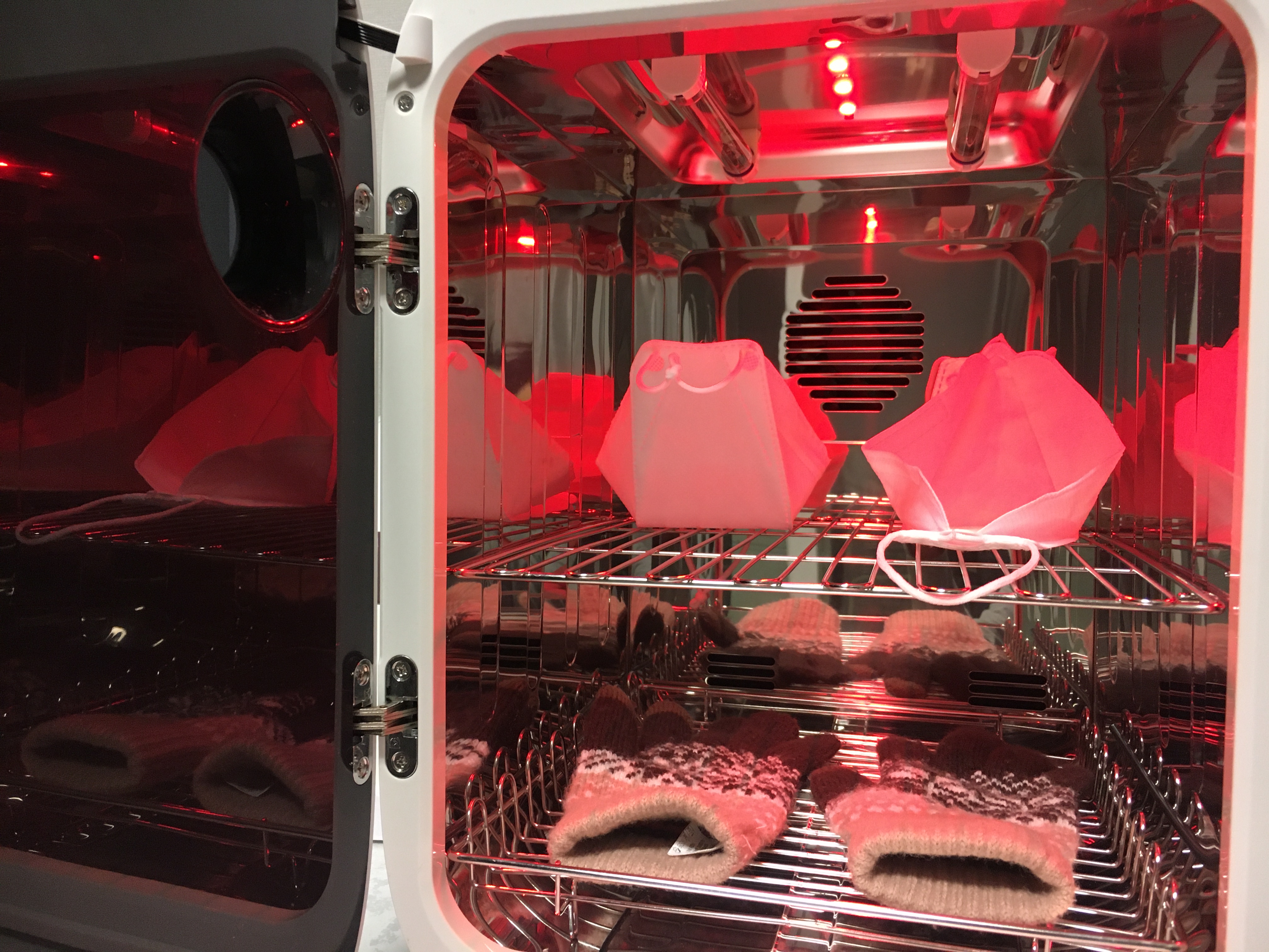 붉은 색 등이 나옵니다. 사람들이 착각하는데 이 등은 그냥 조명일 뿐입니다. 열로 소독하는 게 아니에요. 마스크 소독을 위해 안쪽면을 위쪽으로 해두었고 끼고 다니는 장갑도 넣었습니다. 벽면은 스텐으로 자외선을 반사하여 골고루 뿌려주기에 좋게 통형태로 되어있고 트레이가 떠서 있기때문에 골고루 자외선이 갈 것 같네요.