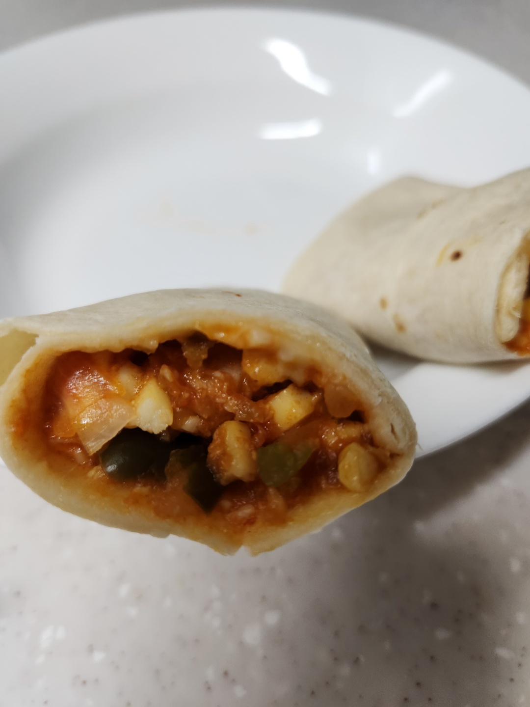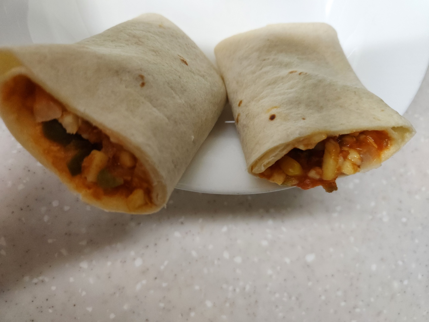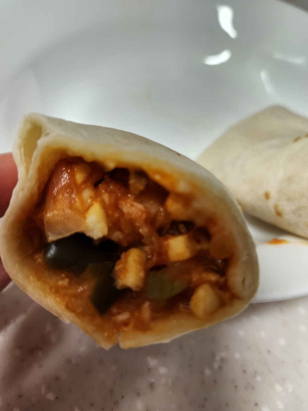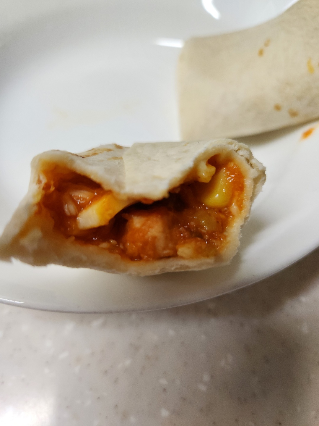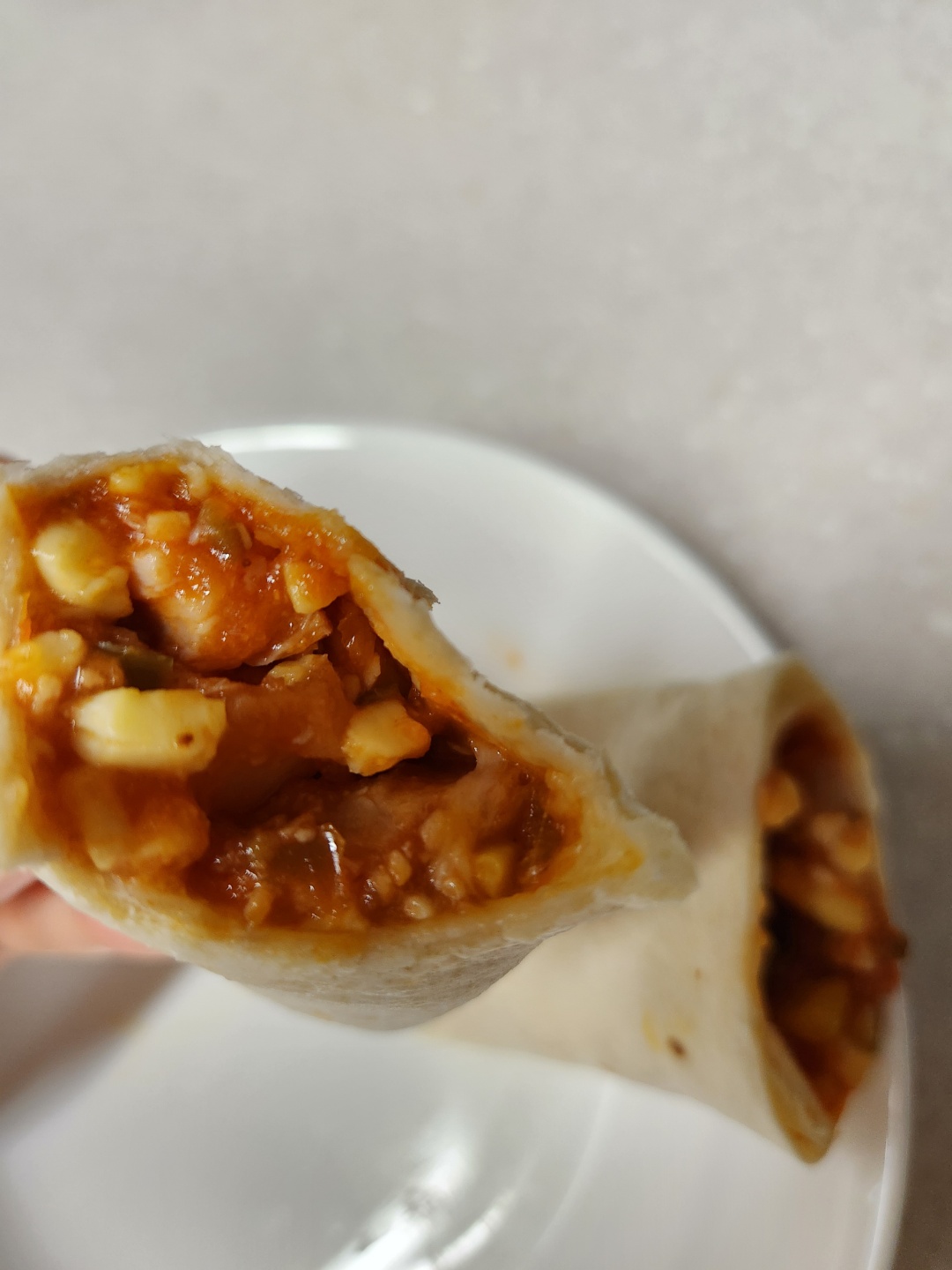 구운 닭가슴살과 야채를 넣고, 매콤한 치폴레 살사소스를 넣은 오뚜기 리얼 멕시칸 또띠아입니다.