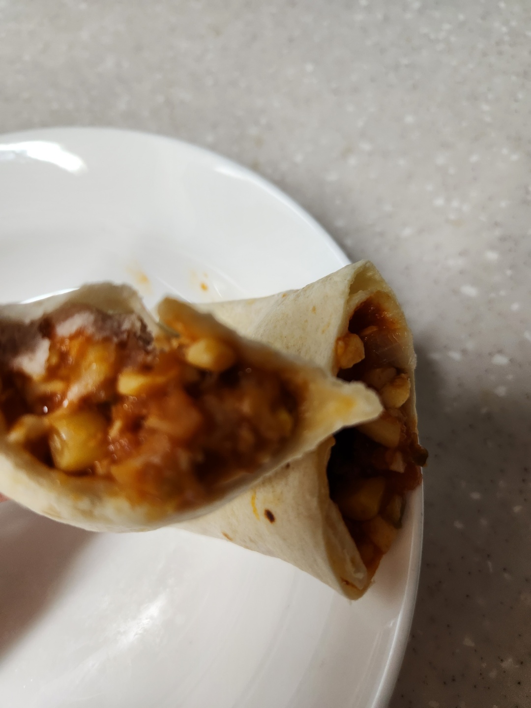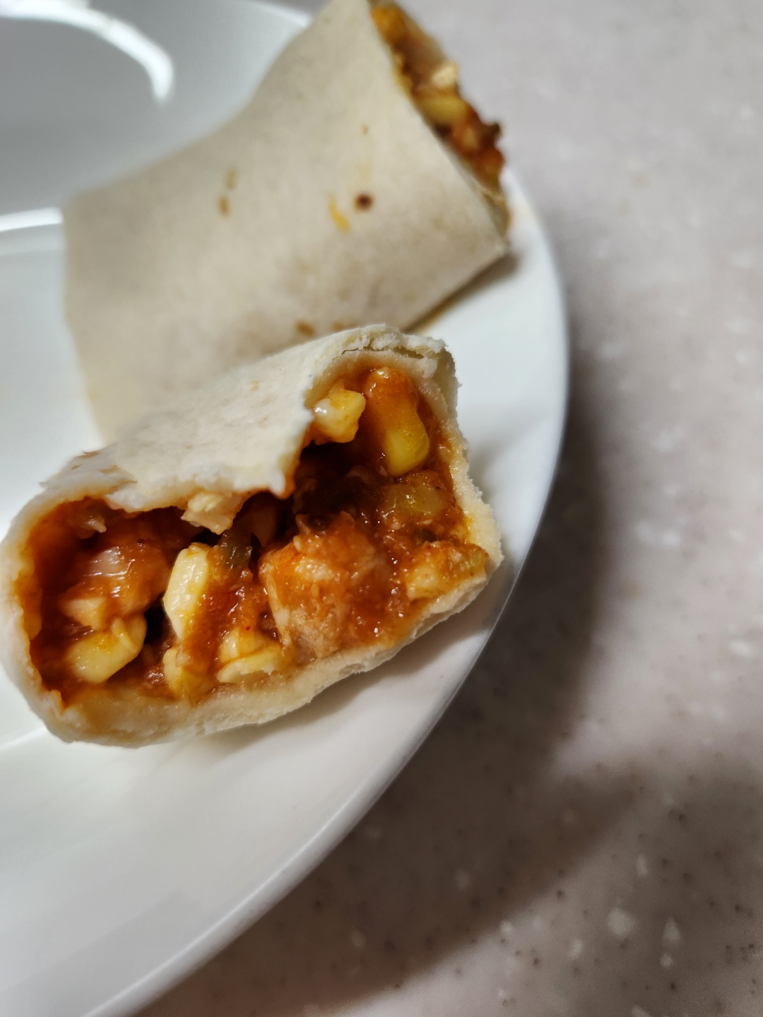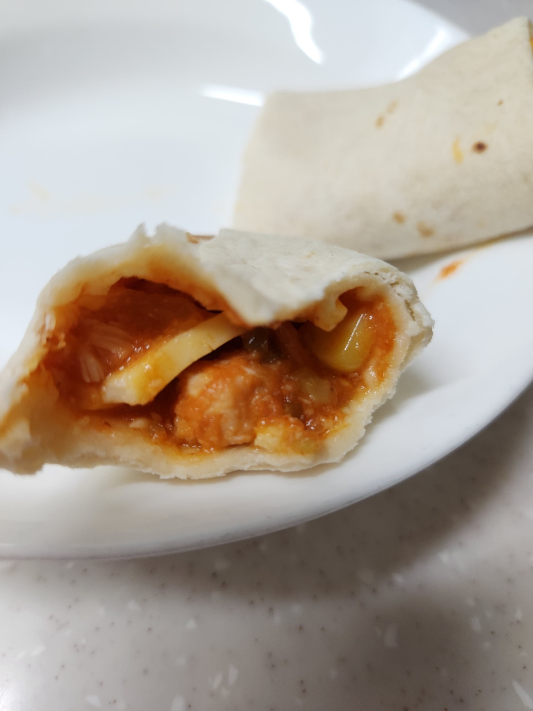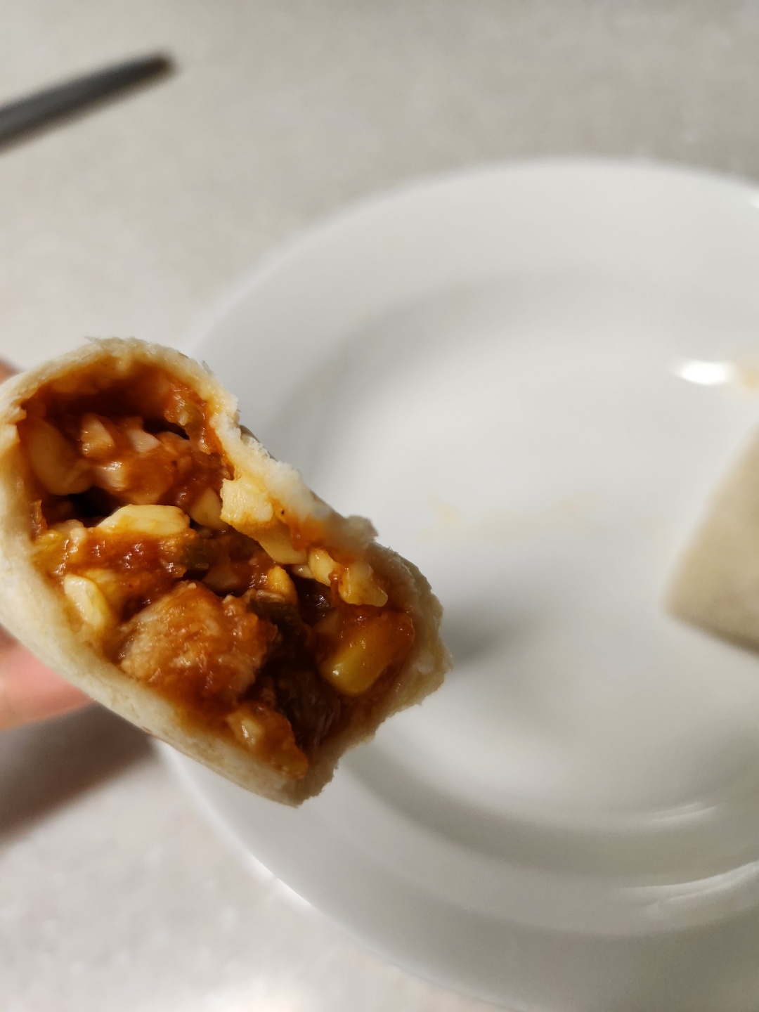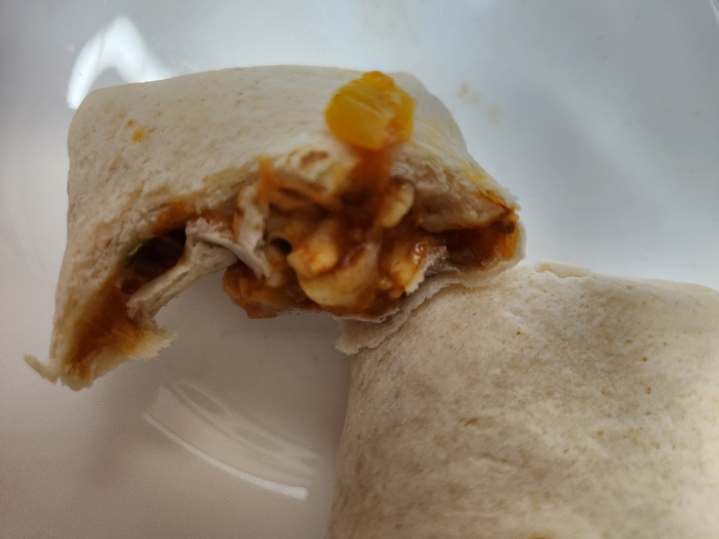 안에 내용물이 보입니다. 옥수수알맹이도 보이고, 닭가슴살도 보이고, 소스도 보이고, 피망과 양파같은 것들도 보입니다.