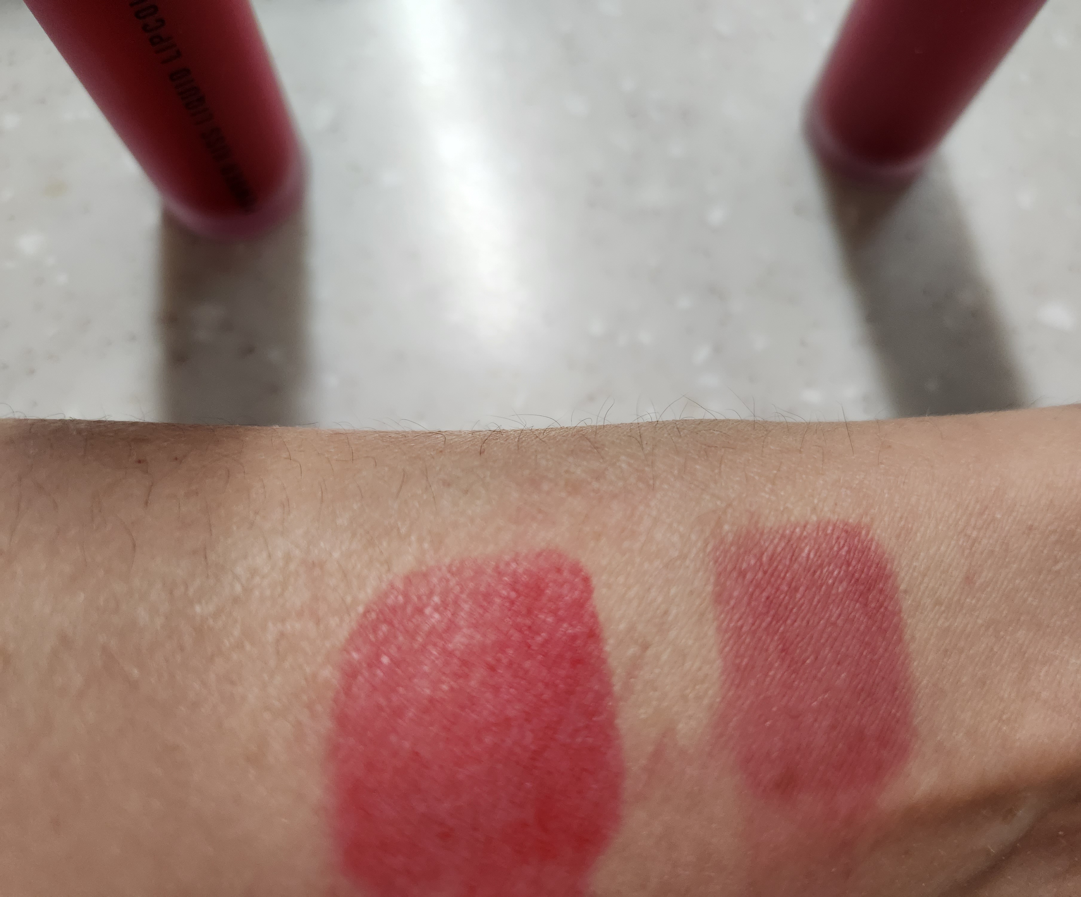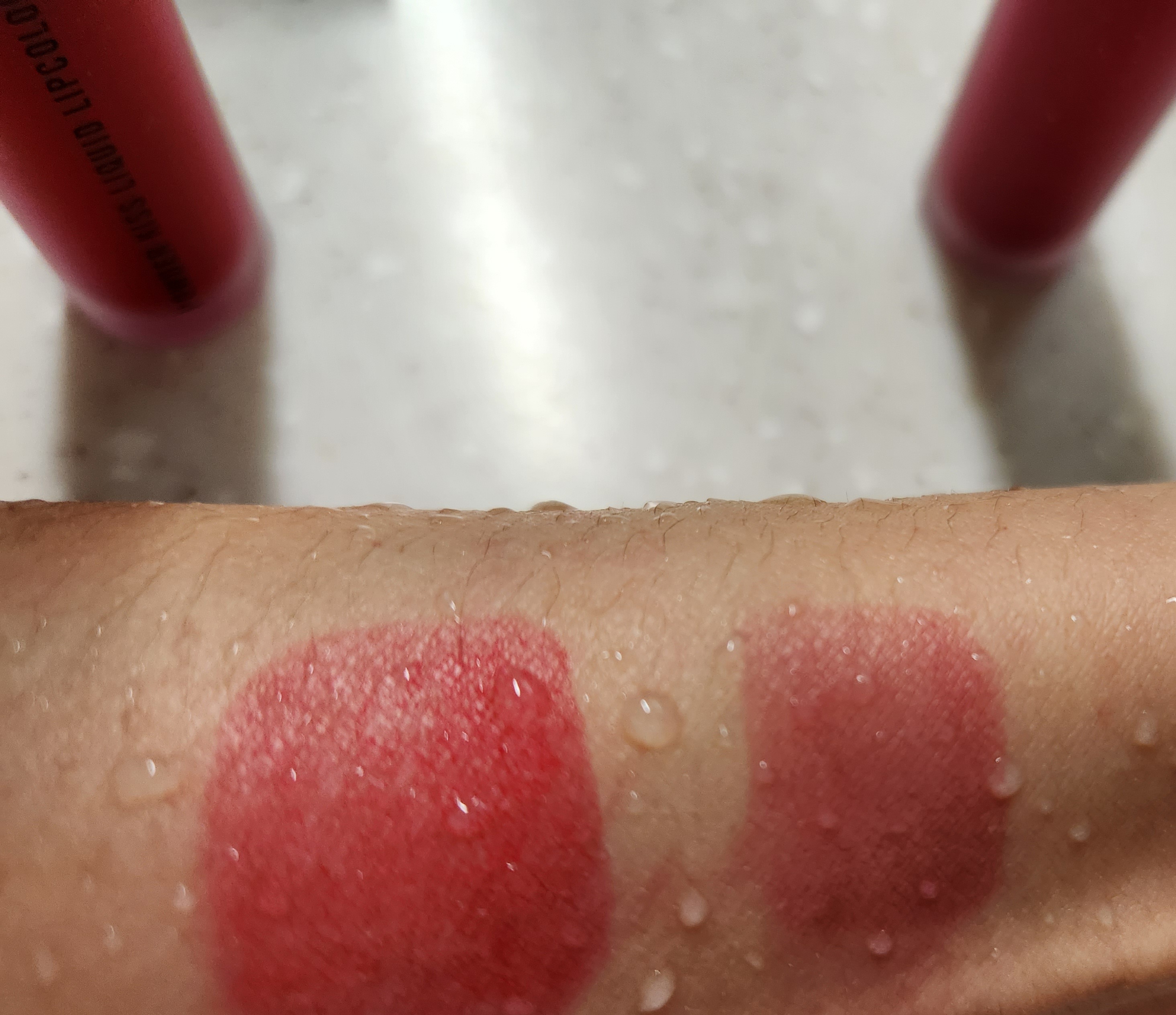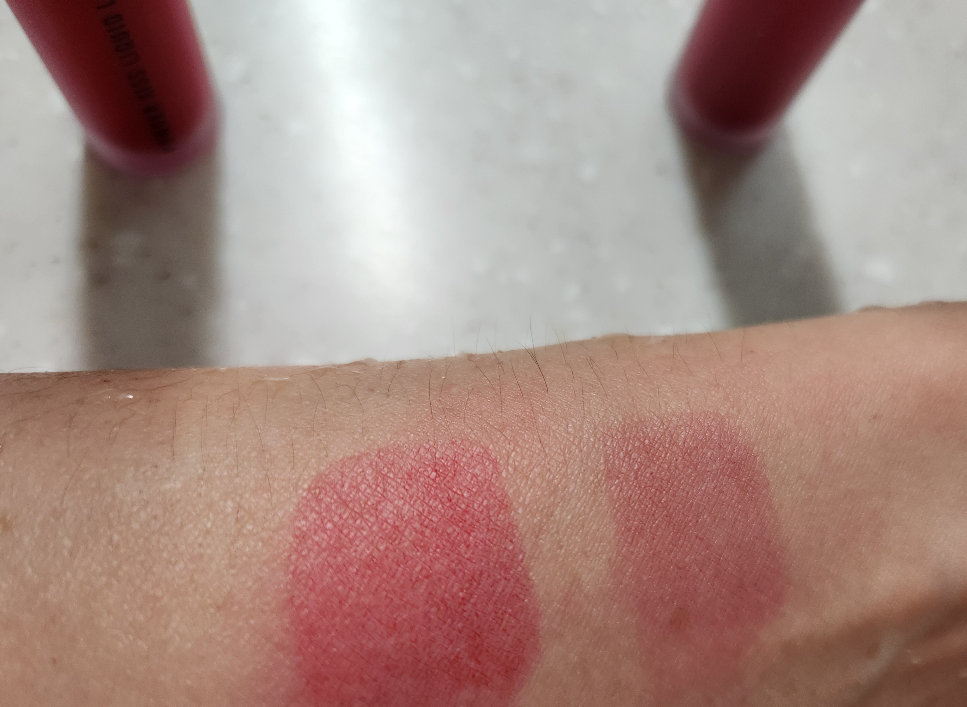 맥 파우더 키스 리퀴드 립컬러를 팔에 스윽스윽 여러번 덧칠했습니다.