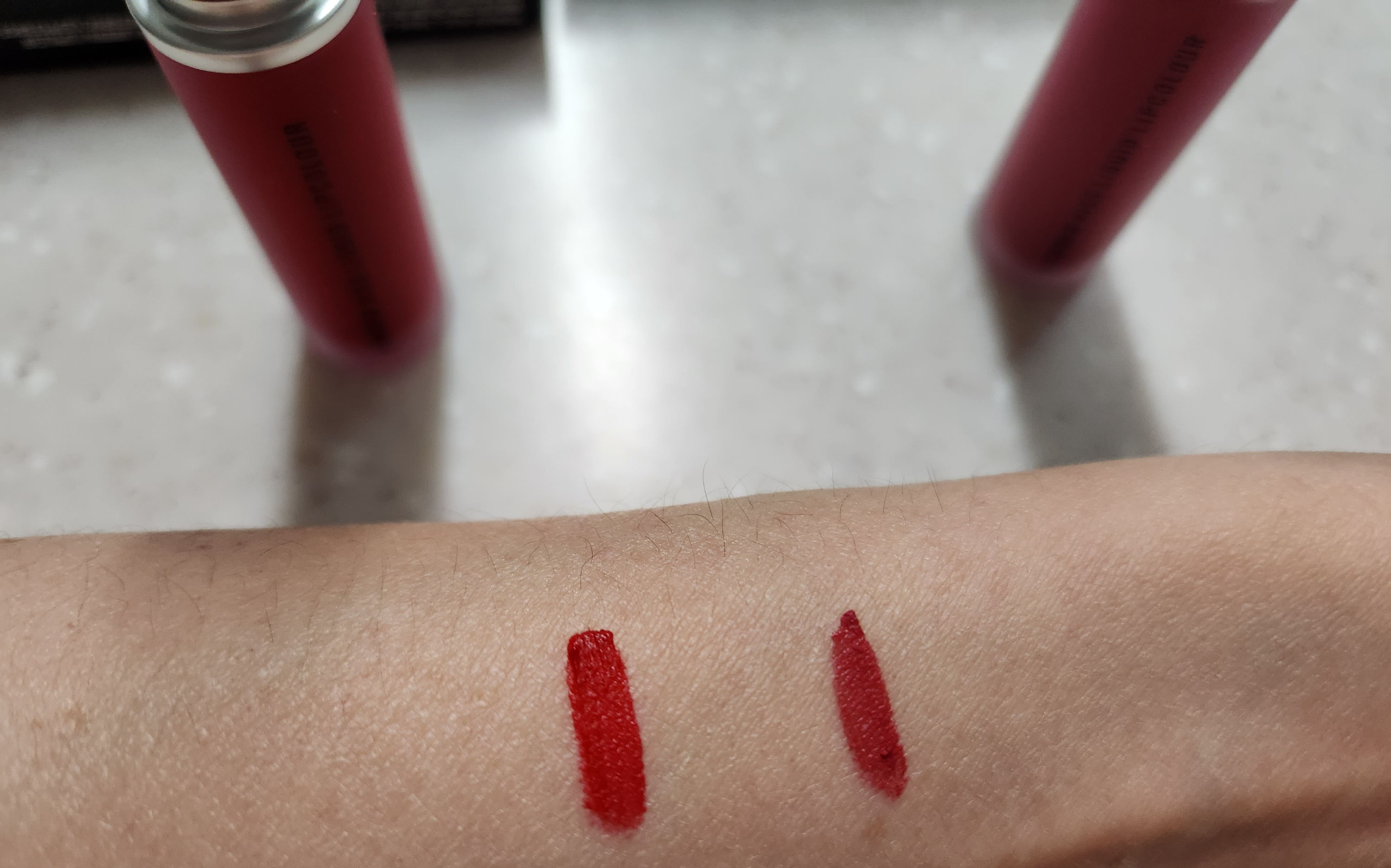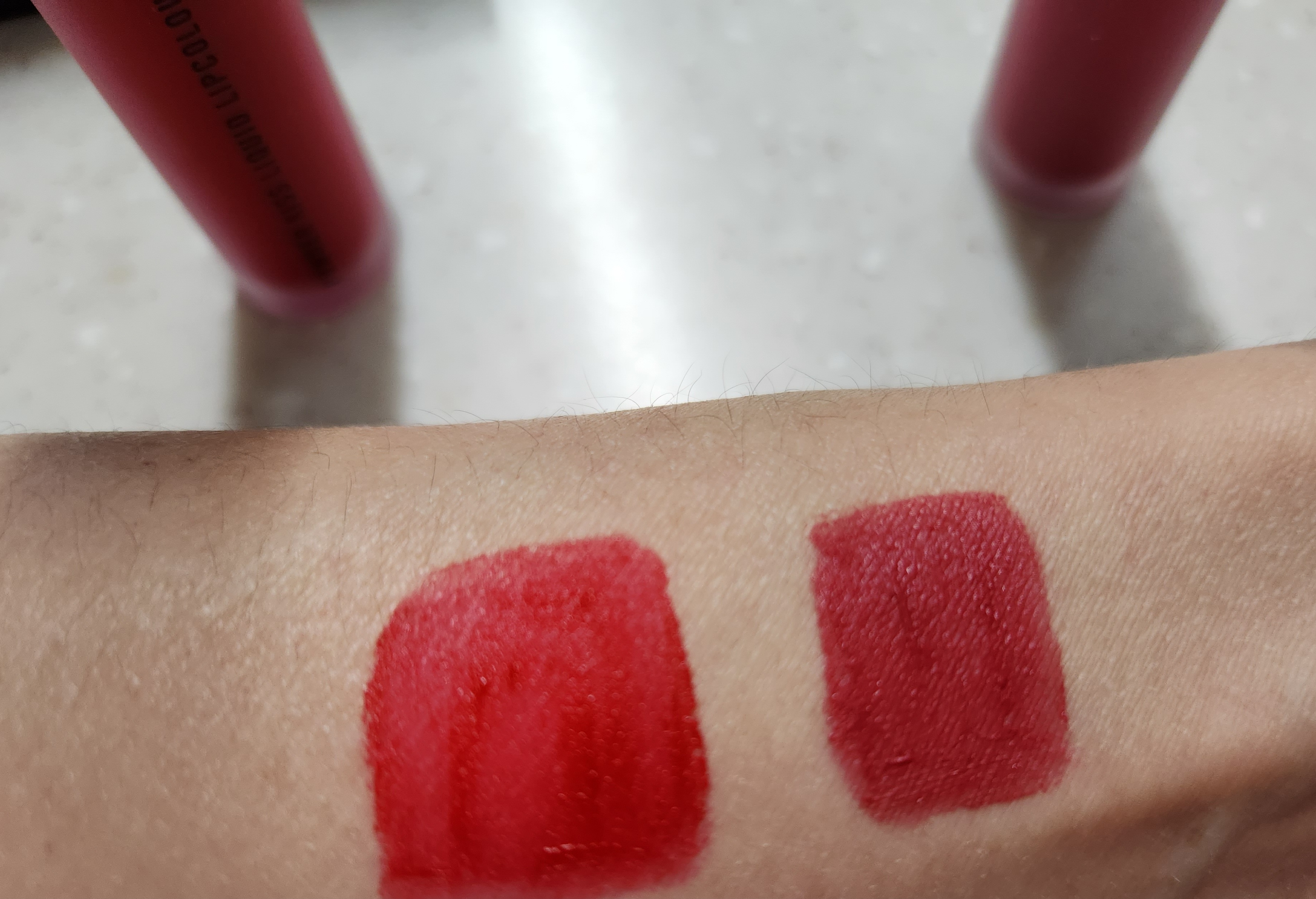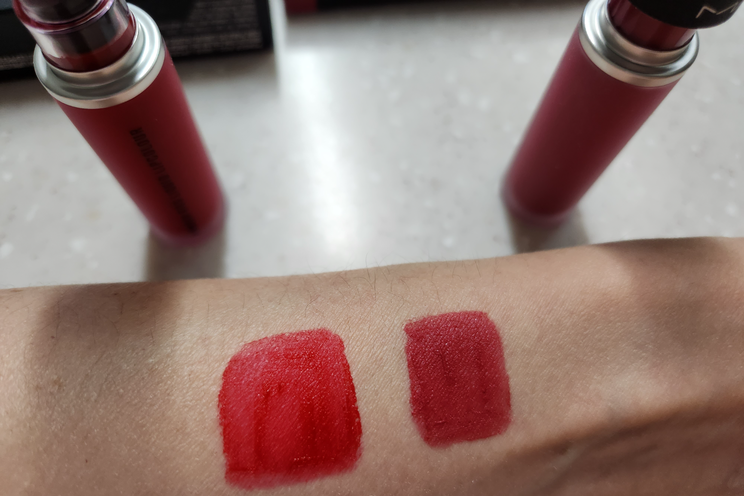 맥 파우더 키스 리퀴드 립컬러를 팔에 스윽스윽 여러번 덧칠했습니다.