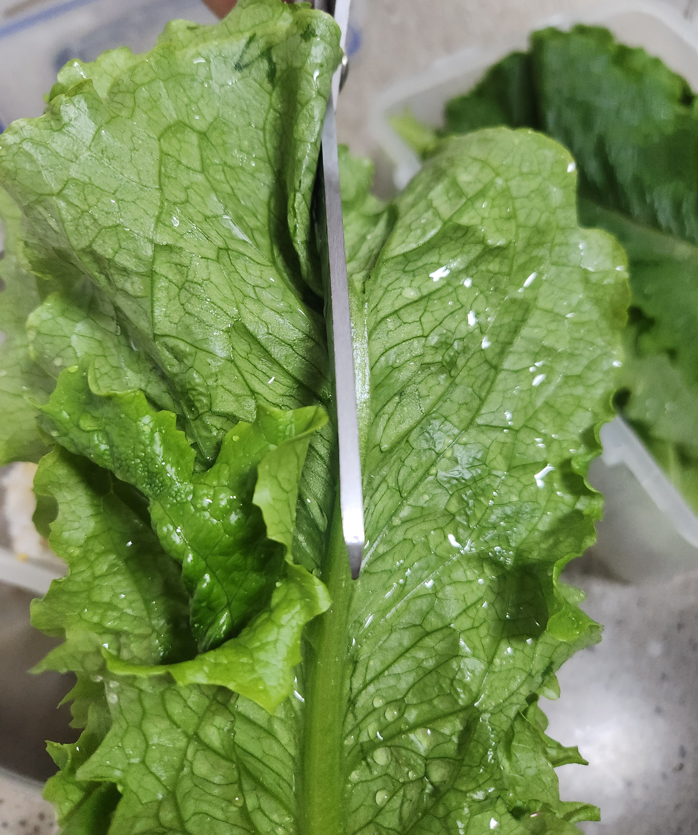 상추 한가운데를 한번 자른 뒤 가위로 작게작게 잘라 넣습니다.